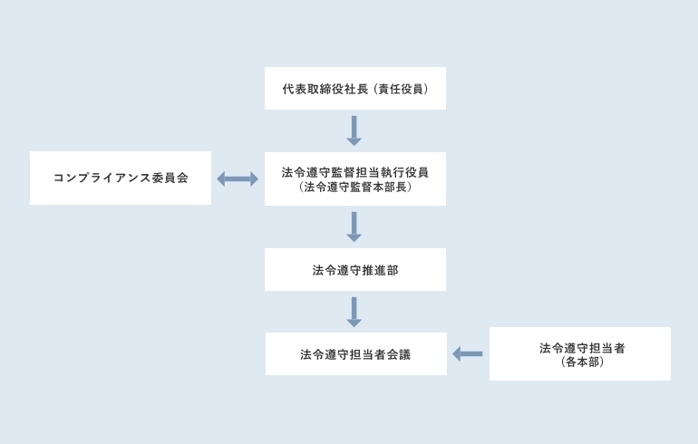 当社の代表取締役社長は、法令遵守責任役員を務め、法令遵守を確保するための措置を行わせる法令遵守監督担当執行役員(法令遵守監督本部長)を指名し、法令遵守を確保する措置を行わせています。