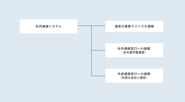 法令(法令のみでなく社内の諸規程、社会倫理その他の規範を含みます)違反の事案または法令違反が疑われる事案に対して、当社の社内通報システムは、①通常の業務ラインでの通報、②社内通報窓口への通報、③外部通報窓口への通報の3種類の手段を整備しています。